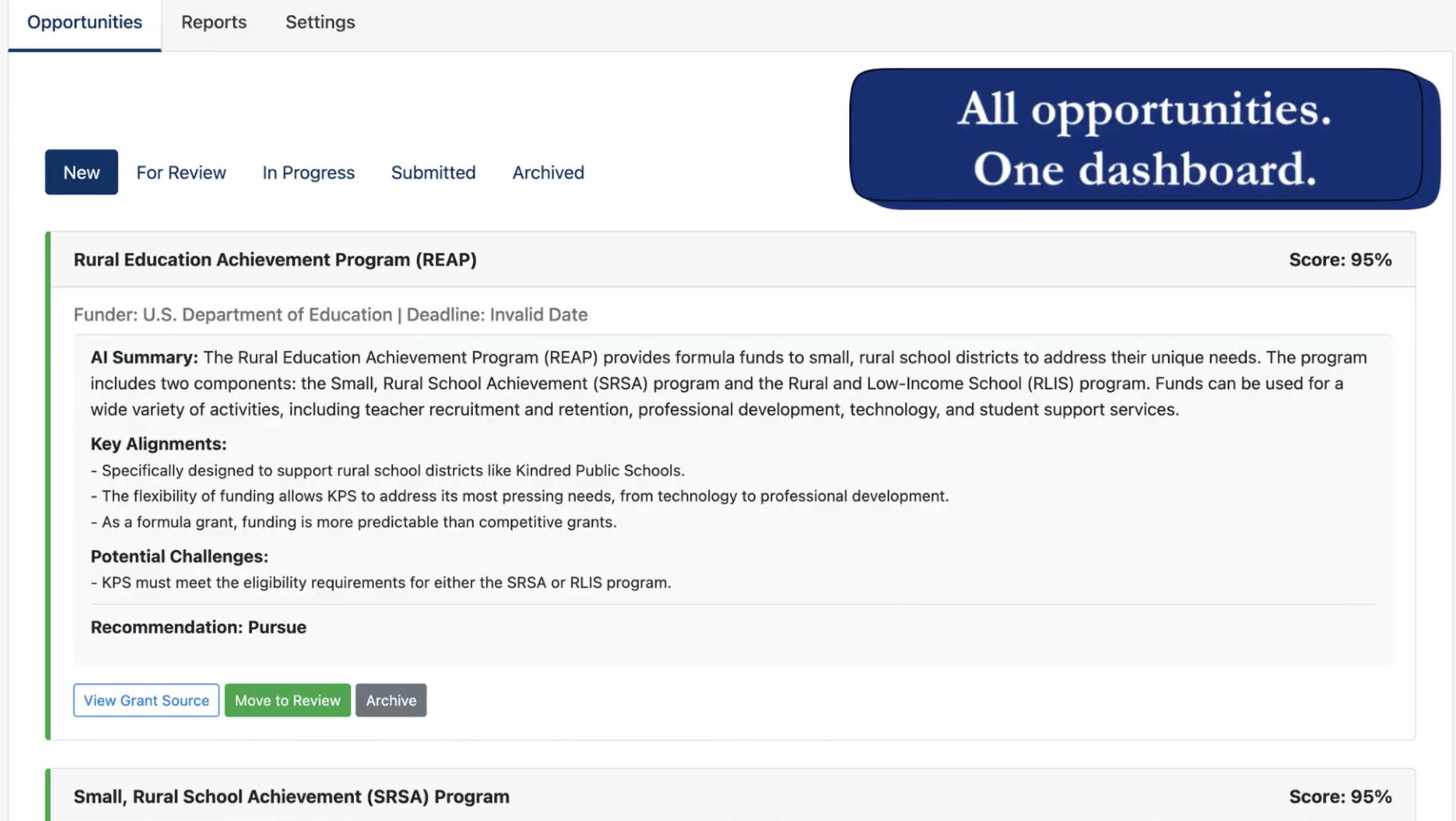 An organization dependent on grant funding was spending countless hours manually searching for and applying to relevant grants — a process that drained staff time and limited the number of opportunities pursued.